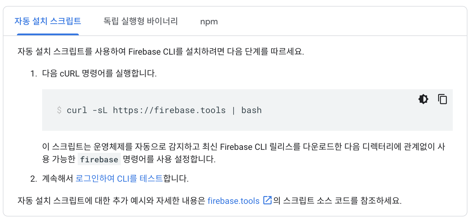 해당 명령어가 안될 경우에는 curl -sL https://firebase.tools | bash 명령어를 사용하면 된다.