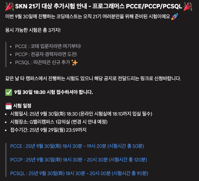 다음주에 진행될 SKN 21기 대상 추가 특별 코딩테스트에서 PCCE를 접수해놓았다.