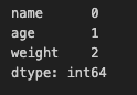 각 컬럼별 결측 개수를 확인하는 방법으로 age 칼럼에 결측치 1개, weight 칼럼에 결측치 2개가 존재한다는 것이다.