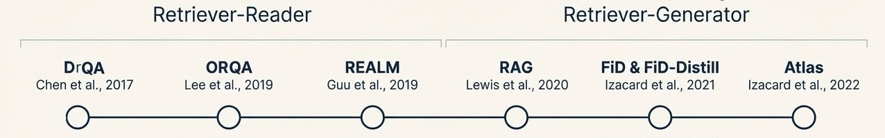 ODQA를 푸는 방법으로 DrQA, ORQA, RAG, Modern이 존재하고,