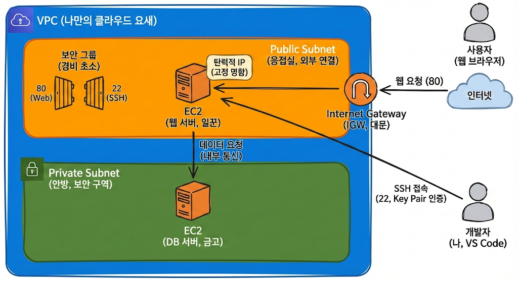 외부 요청은 Public Subnet의 웹 서버 (EC2)가 받고, 실제 데이터 처리는 Private Subnet의 서버나 DB에서 수행하는 형태