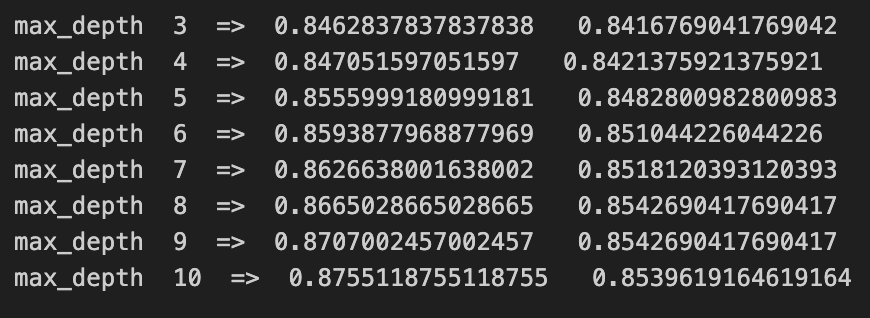 print("max_depth ", max_depth, " => ", result_train[i], " ", result_val[i])